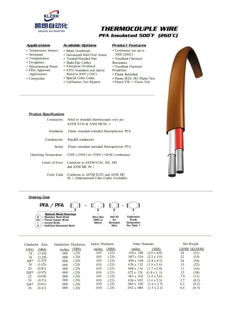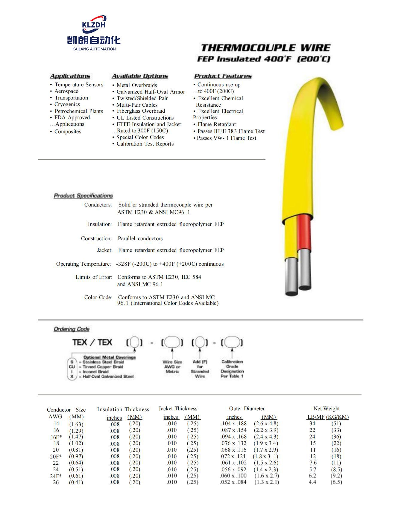 产品规格:导体:实心或绞合热电偶导线 Astme230&ANSI Mc96.1绝缘两层熔融含聚合物聚四氟乙烯胶带