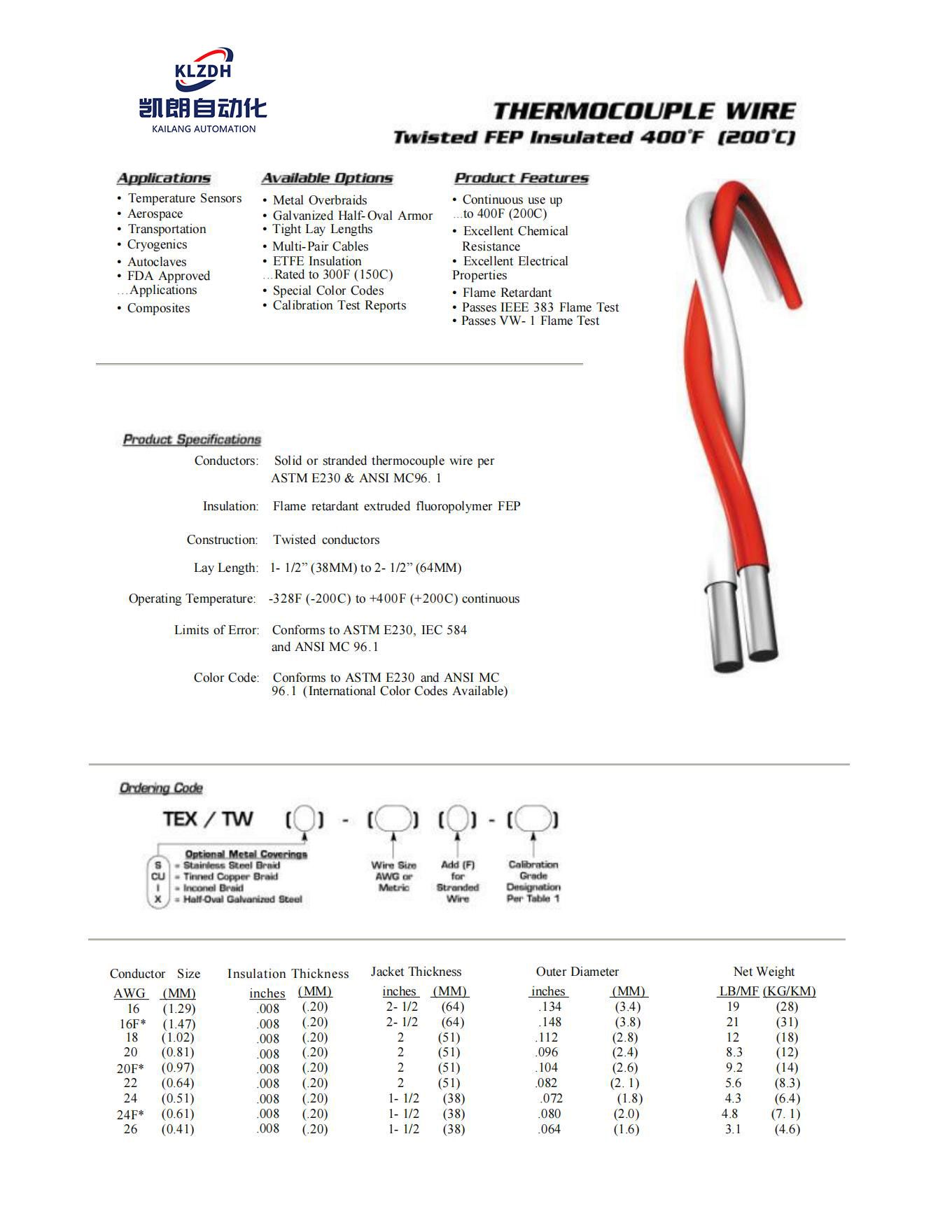 热电偶丝扭曲FEP绝缘400F(200℃)