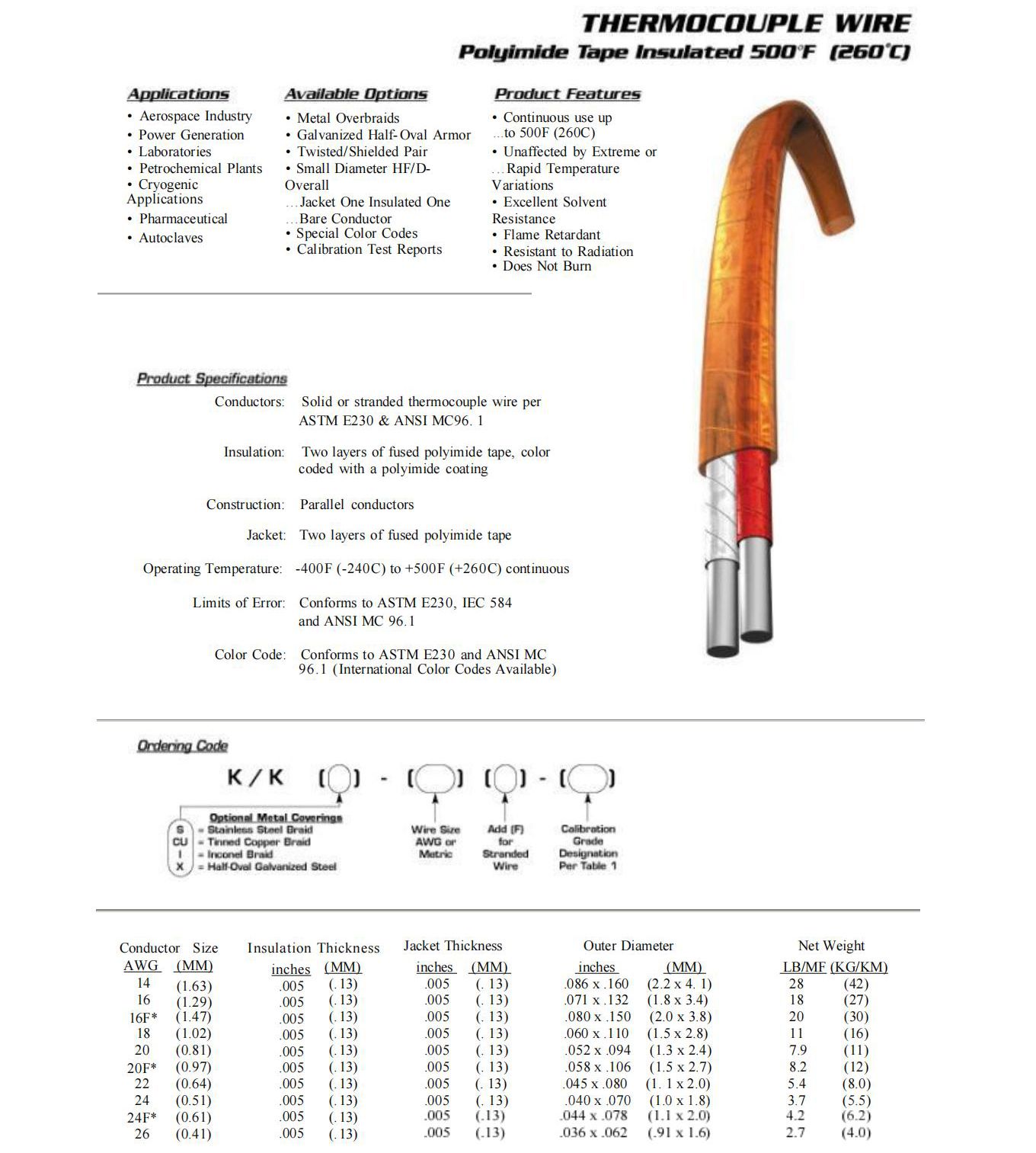 热电偶线聚酰亚胺胶带绝缘500’F(260℃)