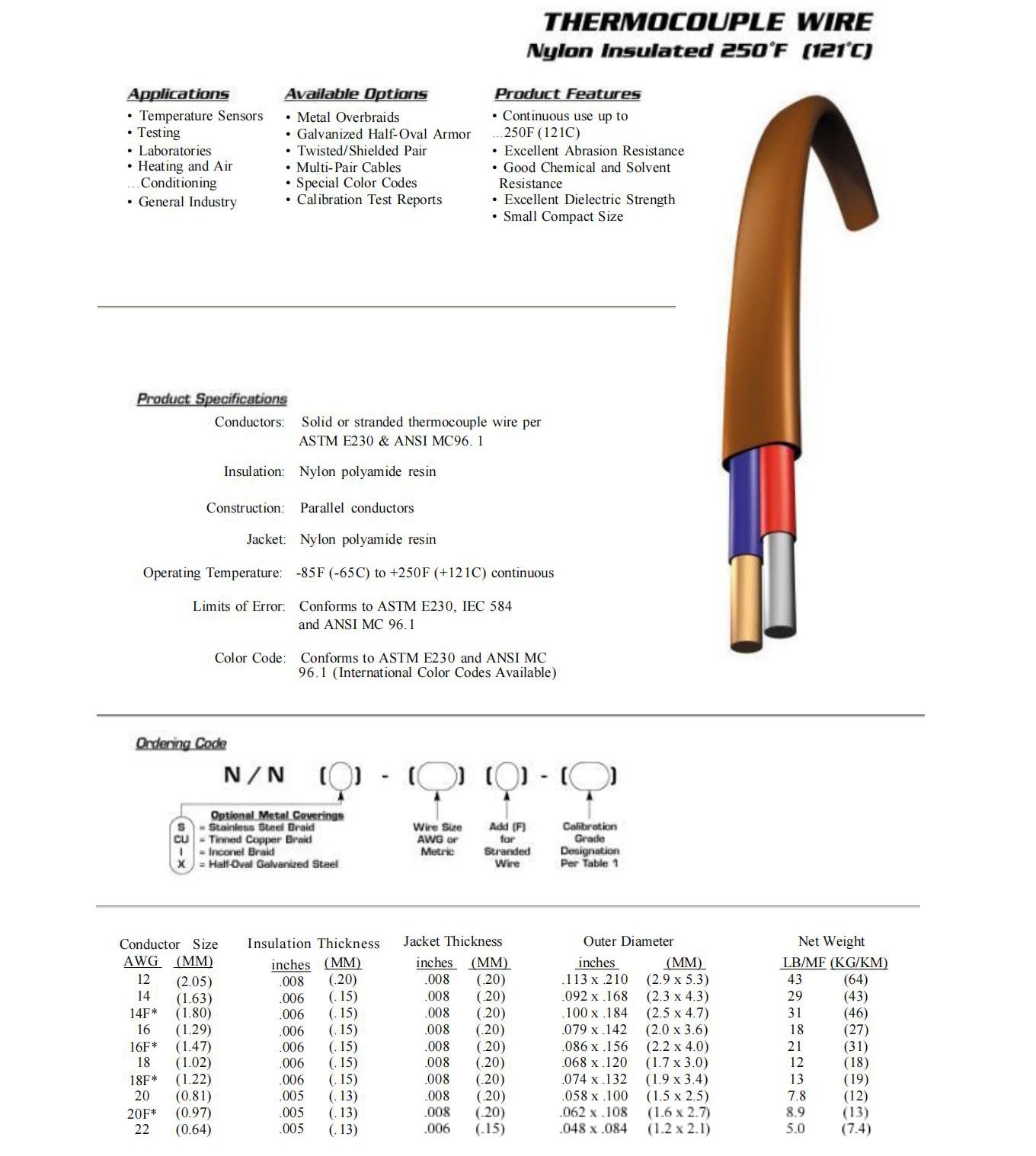 热电偶尼龙绝缘250F(121℃)