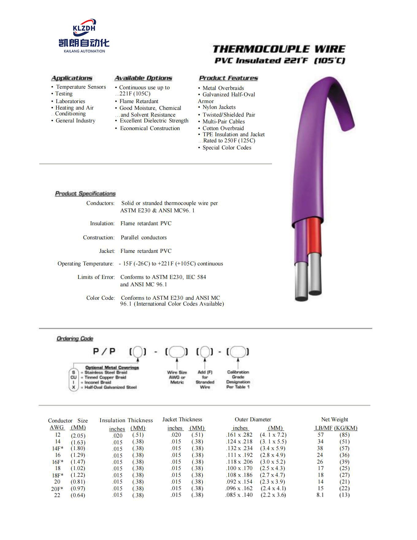 产品规格:导体:实心或绞合热电偶导线Astm e230&ANSI Mc96.1